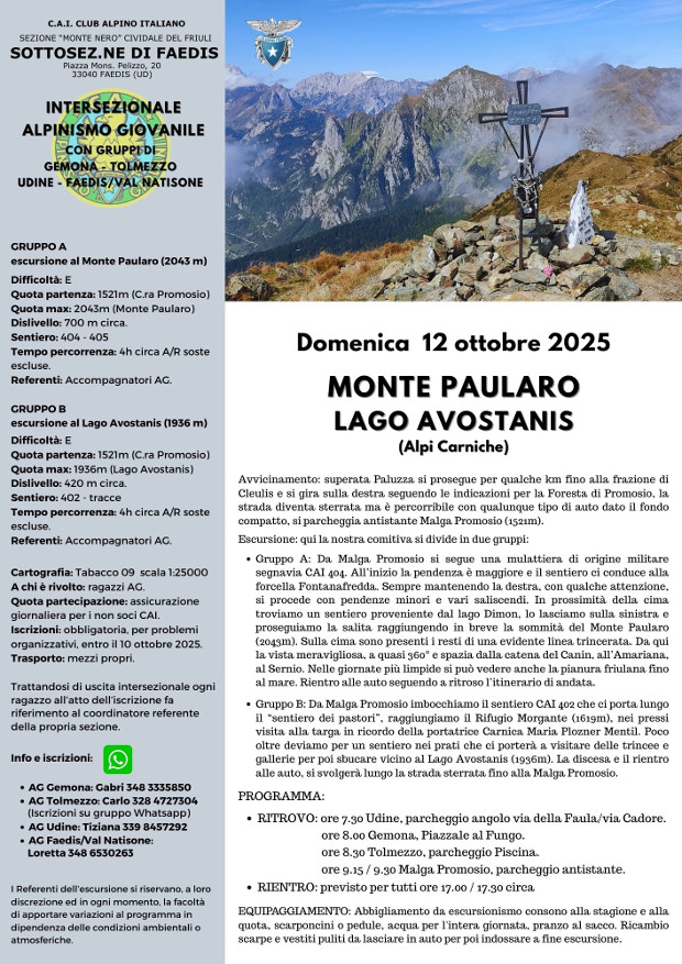 Escursione: Monte Paularo (2043m) - Lago Avostanis (1936m) - (Alpi Carniche) Intesezionale con gruppi AG di Gemona, Tolmezzo, Udine, Faedis/Val Natisone Ragazzi Alpinismo Giovanile e loro genitori