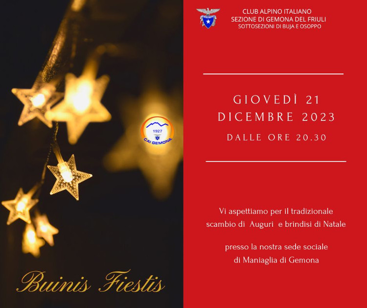 | Giovedì 21/12/2023 dalle ore 20.30 presso la Sede Sociale CAI Gemona in Maniaglia tradizionale scambio di auguri e bicchierata. | |
