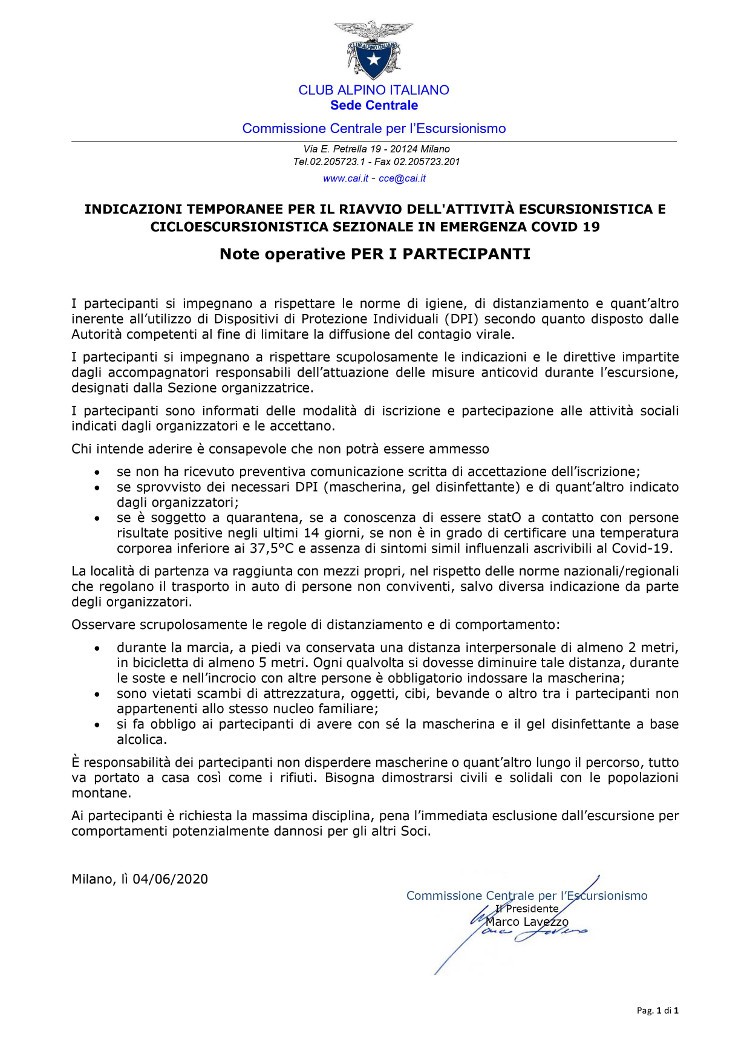 Con comunicazione del 4 giugno 2020 e successive la Sede Centrale del C.A.I. ha ammesso finalmente la ripresa delle escursioni sociali. Oltre alle consuete e note norme (regolamento gite), ne saranno previste alcune aggiuntive finalizzate al contenimento della diffusione del COVID-19 tra cui la compilazione del modulo di autodichiarazione (scaricabile da qui) da consegnare al capogita il giorno stesso in cui si svolgerà l'escursione. La Commissione Escursionismo sta inoltre riorganizzando al meglio il calendario delle attività (date e mete) per poter uscire in sicurezza.
